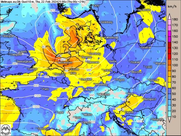 Auf den Karten zu sehen sind die zu erwarten Spitzenwindgeschwindigkeiten (10 m Höhe) in Mittel- und Westeuropa am Donnerstag sowie Freitagfrüh lt. US-amerikanischen GFS-Modells.