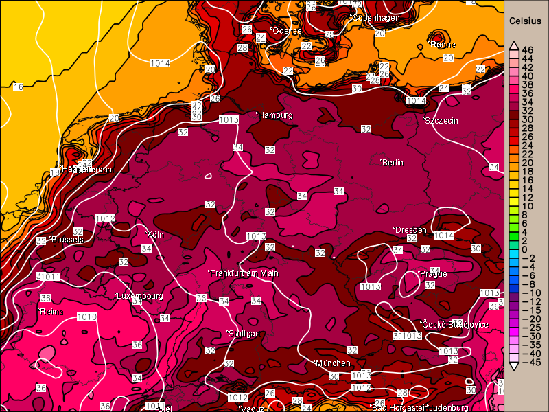 Der GFS-Modelllauf geht dabei von Höchsttemperaturen um 36 Grad im Südwesten Deutschlands aus. Auch im Norden werden laut der Berechung erneut Temperaturen von über 30 Grad erreicht.