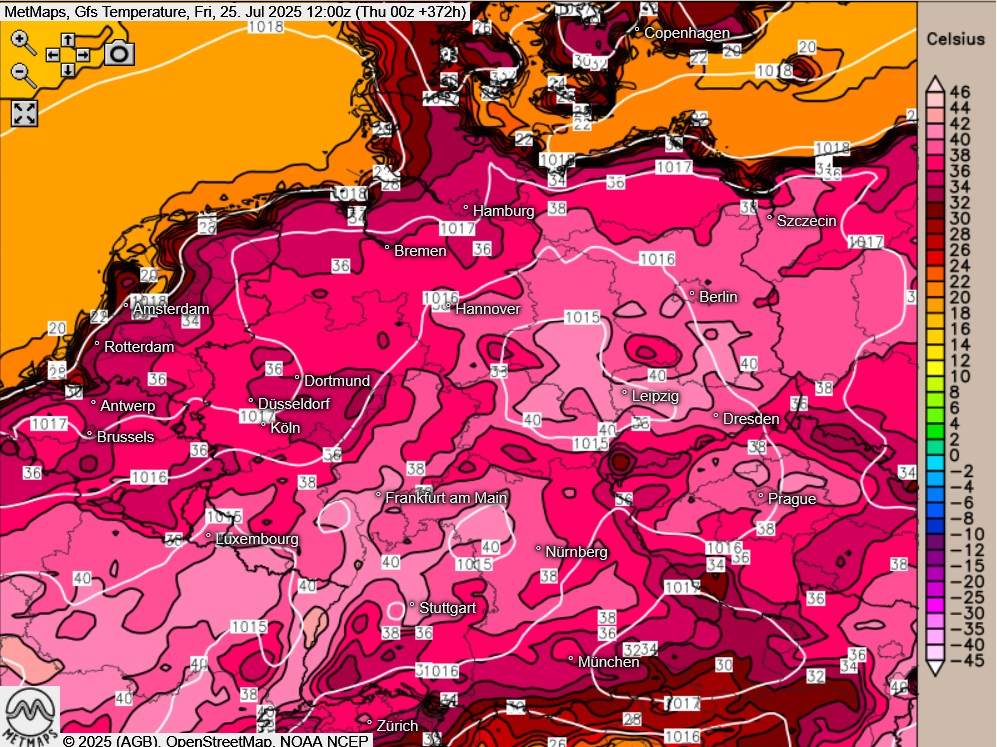 Die Karten bilden die GFS-Lufttemperaturen für Dienstagmittag (22.07.) sowie Freitagmittag (25.07.) ab (Stand: 10.07.) - für Teile Deutschlands sehen die Modelle in über Teile der übernächsten Woche extreme Temperaturen von bis zu 40 Grad.