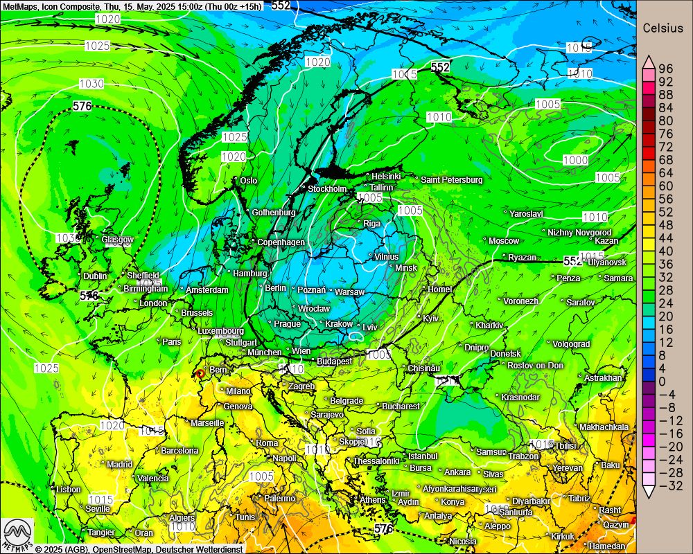 Wetter- und Temperaturkarte Donnerstag, 15 Uhr