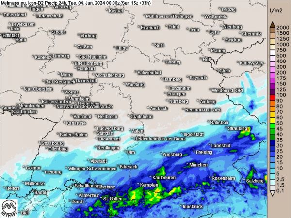 Die Karte zeigt die 24 Stunden-Regenmengen für Bayern und Baden-Württemberg (ICON-D2-Modelllauf) bis Dienstag, 00:00 Uhr: