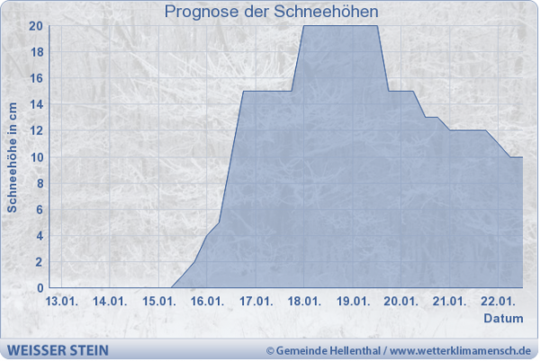 Die folgende Grafik zeigt die Schneehöhenprognose des donnerwetter.de-Parks in der hohen Eifel für die kommenden Tage - auf 20 cm wächst die Schneedecke hier zur Mitte der nächsten Woche an.