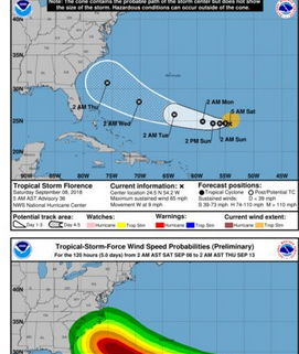 Der erste gefährliche Wirbelsturm kommt auf die Ostküste der USA zu. Florence wird die USA am Donnerstag erreichen. Er wird als Kategorie 3 oder 4 Wirbelsturm in North/South Carolina und weiter nördlich an der Ostküste auftreffen. Bis zum Samstag besteht Gefahr.  Eventuell auch am Sonntag noch an der Ostküste der USA Unwettergefahr.
