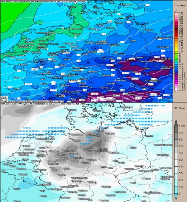 Die beiden folgenden Karten zeigen die Lufttemperaturen und das allgemeine Wetter für den 23.02.2025 (12:00 Uhr) nach ECMWF.