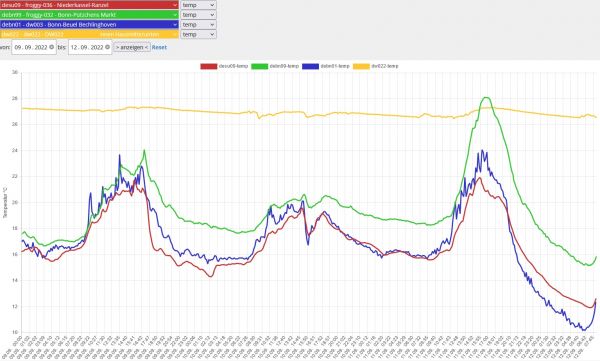 Die grüne Linie gibt den Temperaturverlauf auf dem Festgelände über die ersten drei Veranstaltungstage wieder. Die blaue Linie zeigt den Temperaturverlauf im selben Zeitraum an unserer Wetterstation, die sich nur etwa 500 m entfernt am Rande des Festgeländes befindet. Zeitweise liegen die Temperaturen zwischen Losbuden, Achterbahnen und Karussells drei bis fünf Grad über denen an unserer nahe gelegenen Wetterstation.