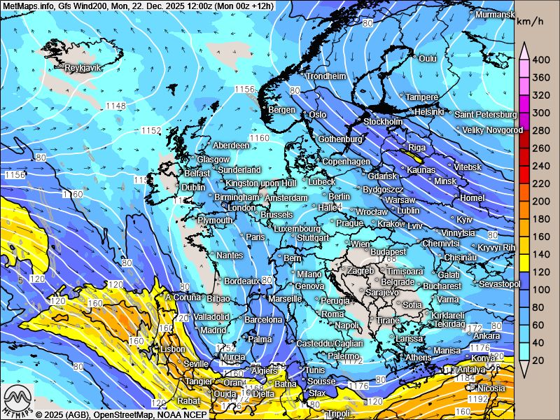 Höhenwindkarte Europa, 22.12.2025 (12:00 Uhr)