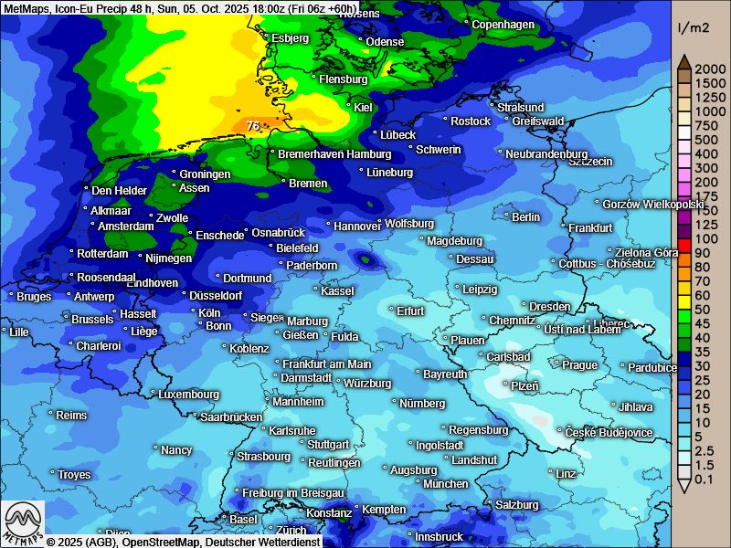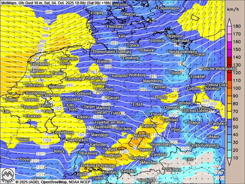 Die aktuelle GFS-Windprognosekarte für Samstagabend (18:00 Uhr) sowie die 48-Stunden-Regenmengen bis Sonntagabend nach Icon: