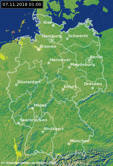 Das Radarbild zeigt aktuell nur wenige schwache Signale, diese deuten jedoch nicht auf Niederschlag. Sonst präsentiert sich der Himmel über Deutschlands teils bewölkt, teils sternenklar. Regional haben sich Nebelfelder gebildet.