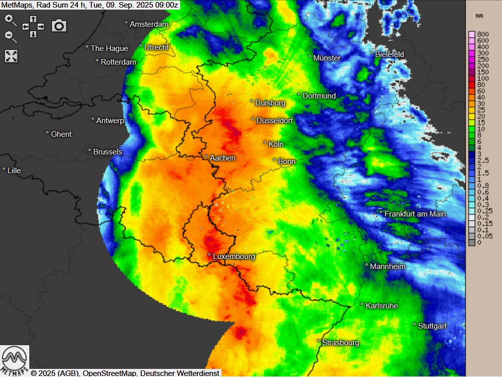 Große Regenmengen in der Fläche und das über 24 Stunden: Für den Westen Deutschlands ist die Unwetterlage am heutigen Dienstag die gefährlichste seit der Flutkatastrophe im Juli 2021.