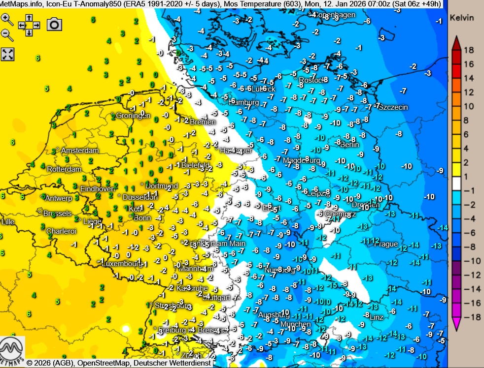Die Milderung kommt zunächst in der Westhälfte an, bis zur Wochenmitte sind dann aber auch im Nordosten Deutschlands strenge Frostwerte erst einmal Geschichte. Im Westen sind Mitte kommender Woche dann sogar Temperaturen im zweistelligen Plusbereich möglich.