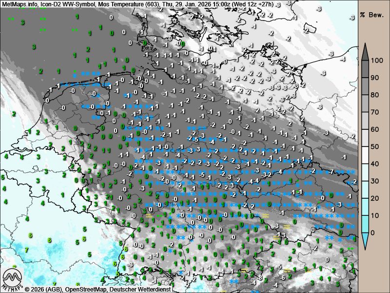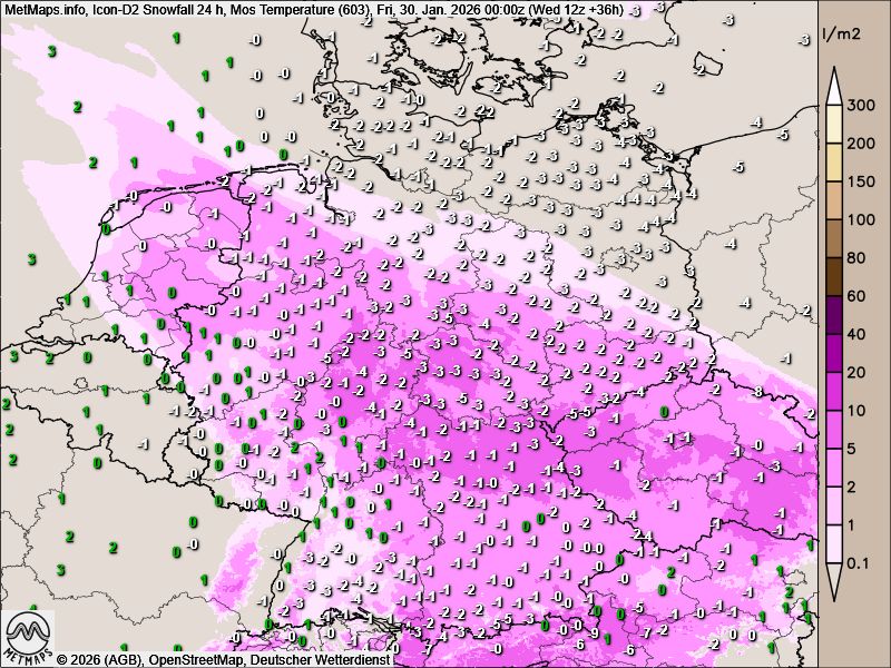 Schnee fällt heute wieder quer über das Land (siehe Karte). Auch am Freitag ist mit leichtem Schneefall zu rechnen, dann entlang der Elbe und insgesamt schwächer. In fast ganz Deutschland liegt morgen eine dünne Schneedecke, einzige Ausnahme ist das Rheintal.
