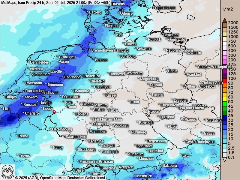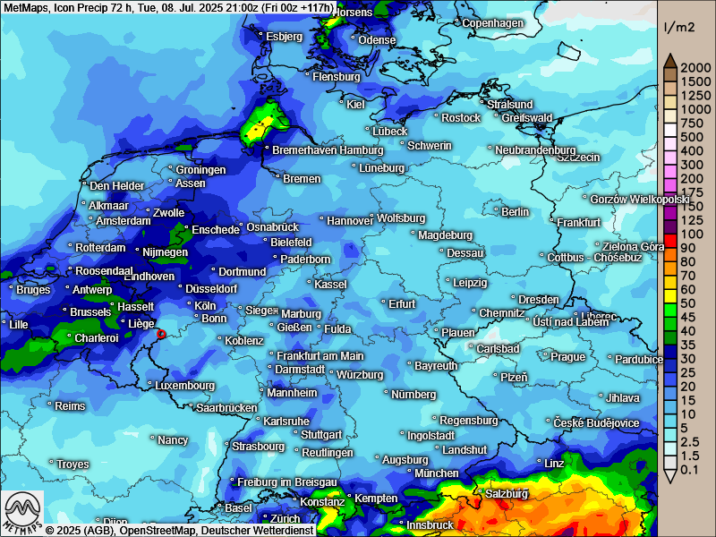 Bis Dienstag kommender Woche bekommen dann auch die Regionen etwas Regen ab, die zuvor leer ausgegangen sind - der Blick auf die akkumulierten Niederschlagssummen bis Dienstagabend: