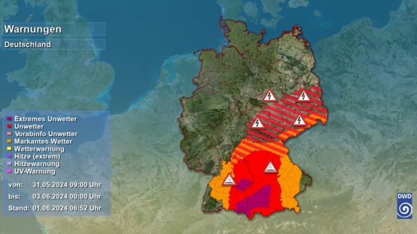 Für Thüringen und Sachsen werden, wie gestern schon erwartet, nicht mehr extremste Mengen berechnet; durch Gewitter sind in den nächsten Stunden allerdings auch hier lokal bis zu 50 l/m² neuer Niederschlag in 12 Stunden möglich, so dass es zumindest stellenweise Probleme mit vollgelaufenen Kellern und Unterführungen geben kann. Lokale Schauer und Gewitter bescheren Teilens Sachsens und Thüringens in der Nacht auf Sonntag nochmals 20 bis 30 l/m².