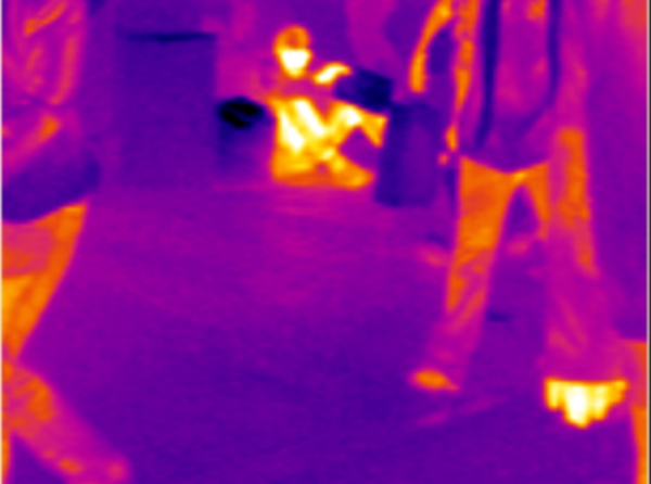 Das Infrarotbild zeigt einen Bettler in der Hohe Straße in Köln bei unter 5 Grad C Außentemperatur.