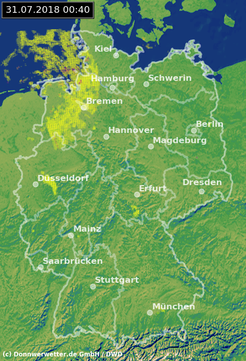 Das Radarbild zeigt aktuell zwar im Nordwesten einige schwache Signale, Regen fällt jedoch nicht. Sonst präsentiert sich der Himmel über Deutschland sternenklar oder nur leicht bewölkt.
