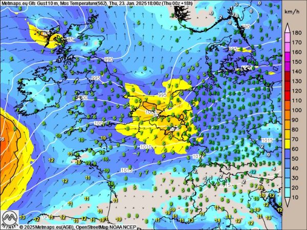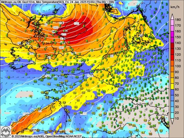 Noch deutlich heftigeren Winden müssen sich die Britischen Inseln stellen - Orkan "Gilles" bringt hier Böen um 150 km/h, teils auch deutlich darüber.