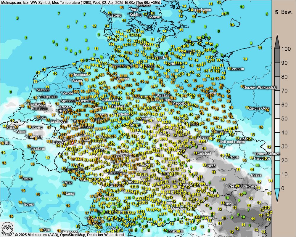 Bewölkung und Temperaturen am Mittwoch (Icon, 15 Uhr)