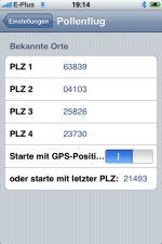 Hinter jeder Kurzwahl der App können Sie in den Systemeinstellungen eine beliebige PLZ hinterlegen und durch drücken des jeweiligen Knopfes bekommen Sie den Pollenflug für diesen Ort angezeigt. Dauerhaft speichern können Sie die PLZs in den Einstellungen ihres iPhones/iPods.