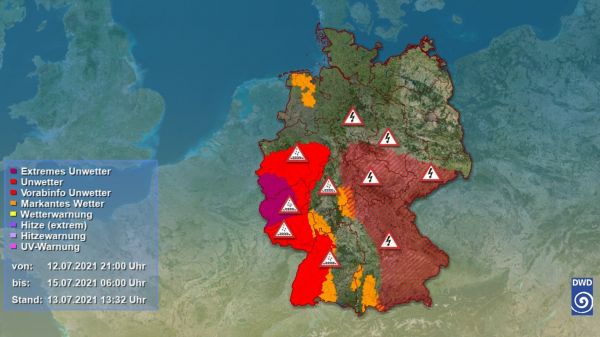 DWD-Warnlage zur Tief Bernd im Juli 2021.