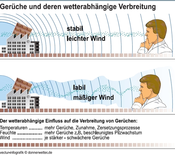 Geruchsbelästigungen im öffentlichen Raum können sehr unangenehm sein. In unserer Infographik zeigen wir, wie das Wetter Gerüche, aber auch Schadstoffe unterschiedlich ausbreitet. Hier spielen Windrichtung und Windgeschwindigkeit eine entscheidende Rolle, aber auch die Stabilität der Luft. Bei labiler Schichtung mit großem vertikalen Temperaturgefälle ist die Durchmischung gut und die Geruchsbelastungen meist eher gering. Die Gerüche können aber weit entfernt von der Geruchsquelle (in unserem Fall eine Schokoladenfabrik) am Boden noch schwach wahrgenommen werden. Höhere Temperaturen und Feuchtigkeiten sorgen für intensivere Gerüche.