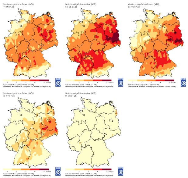 Mit dem Regen in der nächsten Woche sinken auf die aktuell teils sehr hohen Waldbrandrisiken. Erst ab Donnerstag ziehen die Risikenmit der nächsten Hitzewelle wieder deutlich an.
