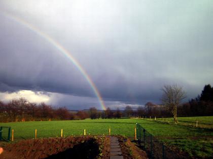 Versöhnung nach einem wechselhaften Aprilwettertag. Regenbögen waren in den letzten Tagen immer wieder in Deutschland zu sehen. In den Abendstunden zeigten sie sich nach dem Abzug der Schauerwolken. Die tief stehende Sonne schien in die Regentropfen und ließ die Bögen in ihrer Farbenpracht aufleuchten.