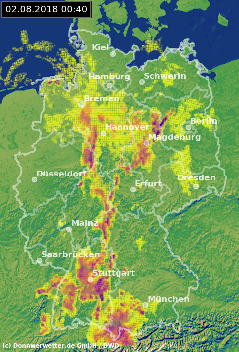 Heute tagsüber bilden sich hauptsächlich in der Südosthälfte in schwül-heißer Luftmasse einige teils heftige Regengüsse und Gewitter. Die Niederschlagsmengen können dabei auf engstem Raum wieder sehr unterschiedlich ausfallen. Vereinzelt sind mehr als 25 Liter pro Quadratmeter zu erwarten.