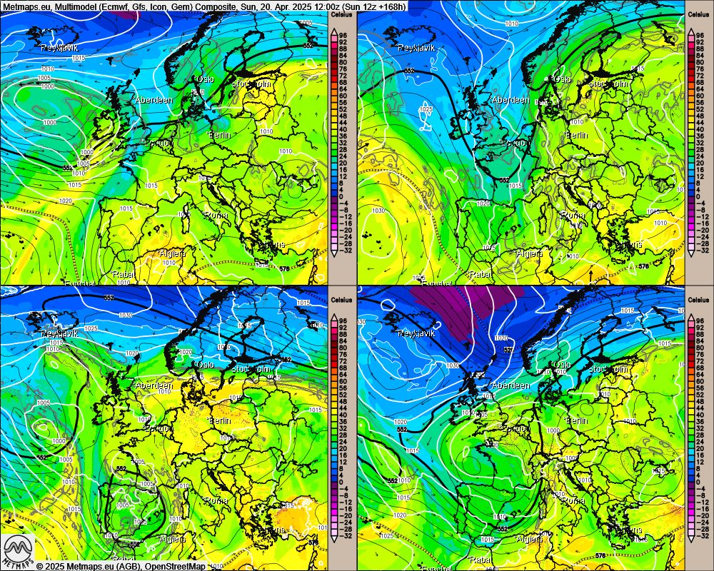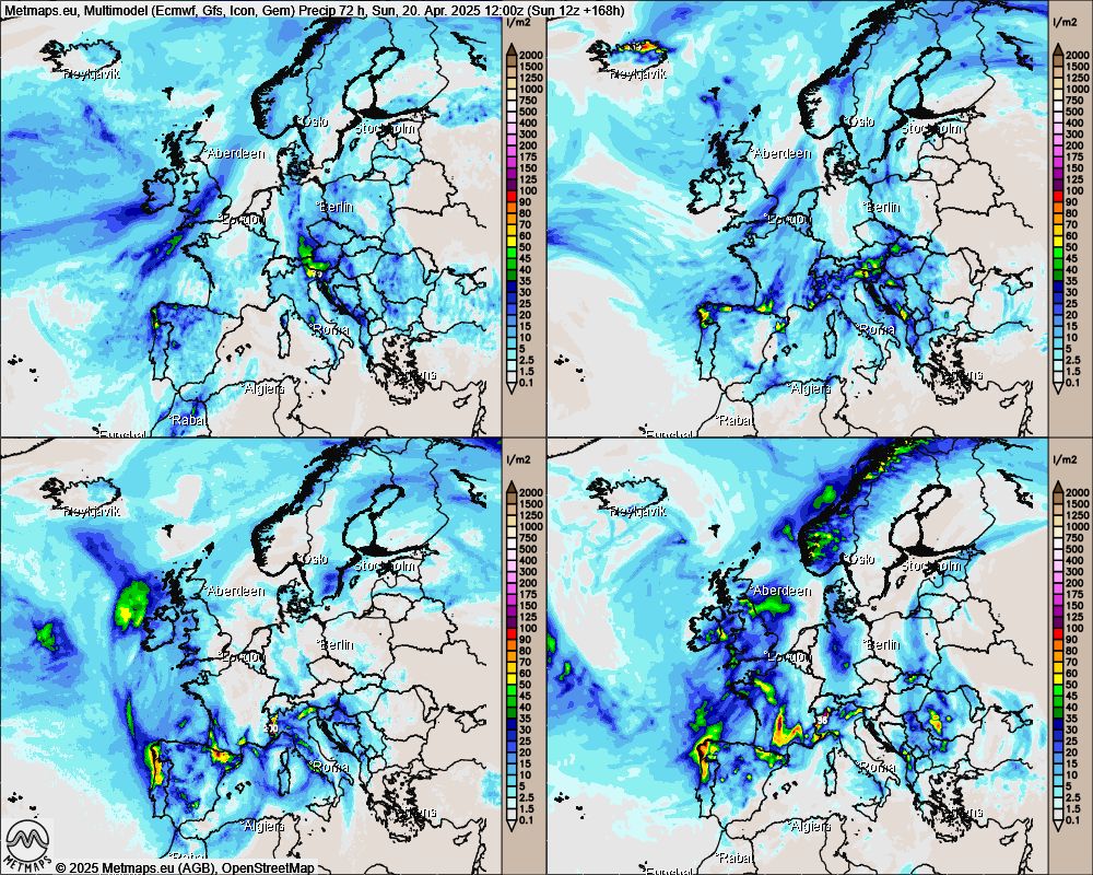 Vier Modelle, vier unterschiedliche Lagen und vier voneinander abweichende 72-Stunden-Regenmengen bis Ostersonntag: Die Multmodellrechnungen zeigen die aktuell noch enormen Unsicherheiten beim Osterwetter 2025.