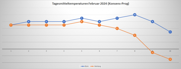 Auf Grundlage der aktuellen Modelle zeigt die Grafik die Mitteltemperaturprognose für Hamburg (orange) und Bonn (blau) vor und während der möglichen Luftmassengrenze.
