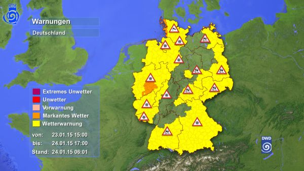 Besonders fällt in Niedersachsen, SH, Hamburg und NRW am Vormittag Schnee. Ab dem späten Vormittag schneit es auch in Hessen, RP, dem Saarland und den östlichen Bundesländern. Am Nachmittag erreicht die Schneefront Baden-Württemberg und Bayern. Auf den Straßen ist mit erheblichen Behinderungen zu rechnen. Bitte informieren Sie sich ständig über die Wetterlage.