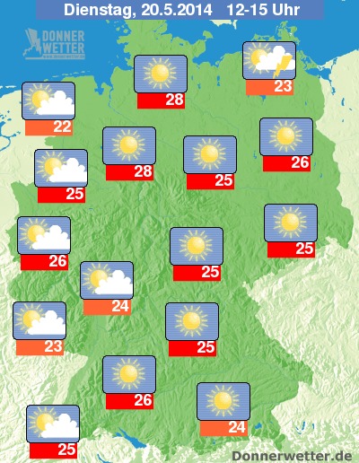 Bis zu 30, ja 31 Grad C sind lokal heute möglich. Schauer und Gewitter sind selten.