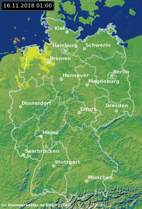 Das Radarbild zeigt aktuell im Nordwesten zwar einige schwache Signale, diese deuten allerdings nicht auf Niederschlag. Sonst präsentiert sich der Himmel über Deutschland häufig sternenklar oder nur leicht bewölkt, insbesondere im Südwesten jedoch meistens neblig-trübe. Im übrigen Land haben sich nur regional Nebelfelder gebildet. Abgesehen von Nebelnässen oder geringem Sprühregen ist es trocken.