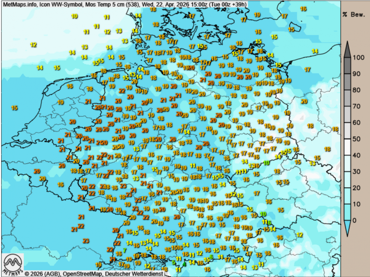 In Nordrhein-Westfalen und Teilen Hessens bewegen sich die Werte im Grenzbereich zwischen 9 °C und 11 °C. Hier wächst der Spargel stetig, aber langsamer. In Gebieten mit sandigen Böden, die sich schneller erwärmen als schwere Lehmböden, dürfte die Ernte dennoch bereits gut angelaufen sein.