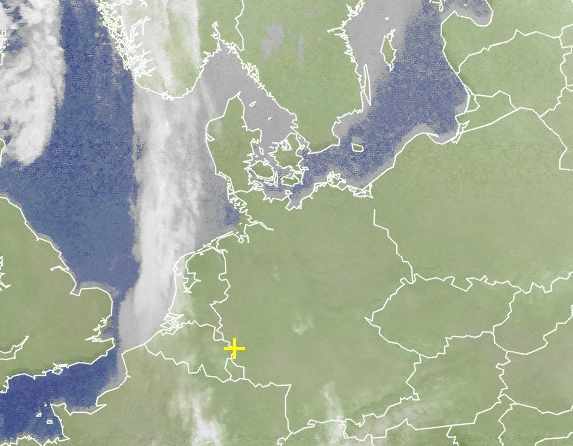 Das aktuelle Satellittenbild zeigt die schwache Wetterfront über dem Kanal, die am Nachmittag die rheinischen Karnevalshochburgen erreichen wird. Ein bisschen Sprühregen ist möglich. Im Nordosten ist es kalt und sonnig bei 2-4 Grad C. Am Rhein bei Hochnebel werden 6-8 Grad C erreicht. In Bayern locken Wolken bei 2 Grad C nach draußen.