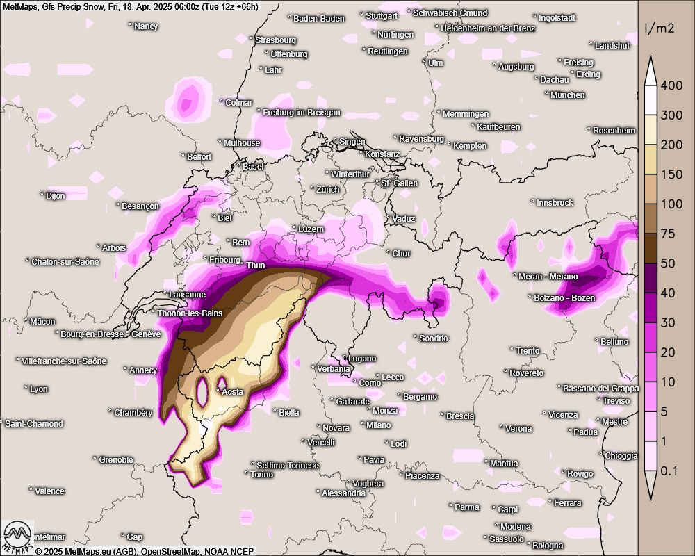 In der Südschweiz, evtl. auch Tessin, Norditalien (Gardasee, Ortasee) und den französische Seealpen fallen die Niederschläge bis Karfreitag auch als Schnee. Und der kommt nicht zu knapp: Ab 1.500 Metern Höhe fallen teilweise zwei Meter Neuschnee!