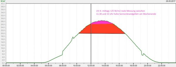 UV-A-Stahlung am 26.5. - akute Sonnenbrandgefahr vor allem zwischen 11.30 Uhr und 15.00 Uhr. Über 25 W/m² zeigte unser Sensor an.