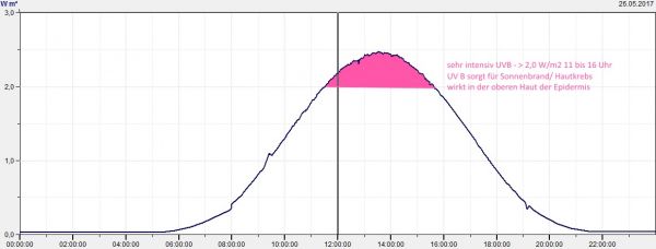 Auch die UV-B-Strahlung war an jenem Tag mit über 2 W/m² sehr intensiv. Die UV-B-Strahlung ist maßgeblich für Sonnenbrand und Hautkrebs verantwortlich und wirkt in der oberen Haut der Epidermis.