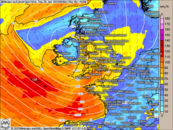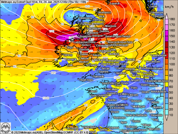 Die Eckdaten des Monstersturms sind beängstigend: Bereits in der vergangenen Nacht traf "Éowyn" mit Windgeschwindigkeiten von bis zu 170 km/h auf Land. Im Westen Irlands sind gar Windgeschwindigkeiten um 200 km/h im Rahmen des Möglichen; und somit auch ein möglicher neuer Windrekord: Die bislang stärkste gemessene Windböe verzeichnete man in Irland vor genau 80 Jahren in Limerick (182 km/h).