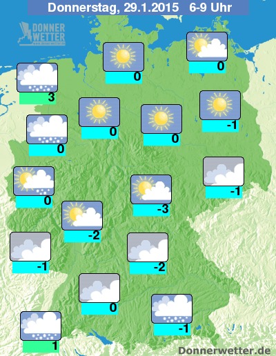 Die Kaltfront des Tiefs bekommen wir so richtig dann am Donnerstagmorgen zu spüren. Zur Rush-Hour in der Früh liegen die Werte zwischen -3 Grad C in den Mittelgebirgen und + 3 Grad im äußersten Nordwesten. Vor allem Verkehrsteilnehmer im Süden und Westen sollten sich auf glatte Straßen sowie Schnee- und Schneeregenfall einstellen.