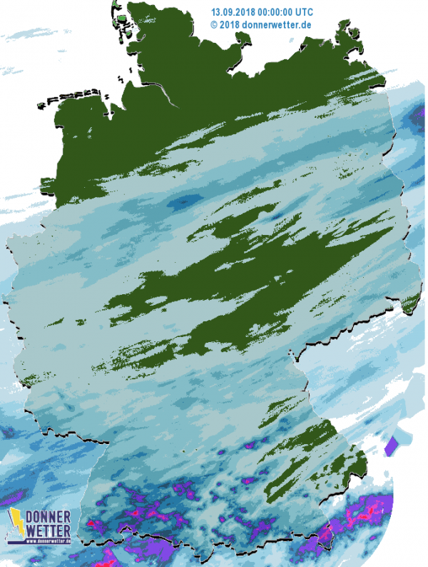 Heute kann es vor allem im Südwesten, in den östlichen Mittelgebirgen und südlich der Donau noch zu örtlichen Regengüssen und einzelnen Gewittern kommen. Die Niederschlagsmengen liegen dabei allgemein zwischen 1 und 10 Liter pro Quadratmeter, vereinzelt auch mehr. Sonst bleibt es überwiegend trocken.