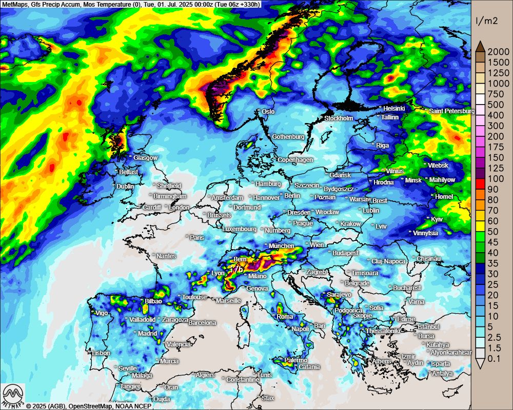 Die Karte zeigt die durch das US-amerikanische Wettermodell GFS akkumulierten Regenmengen bis zum 01.07. - es geht in den Dürresommer 2025!