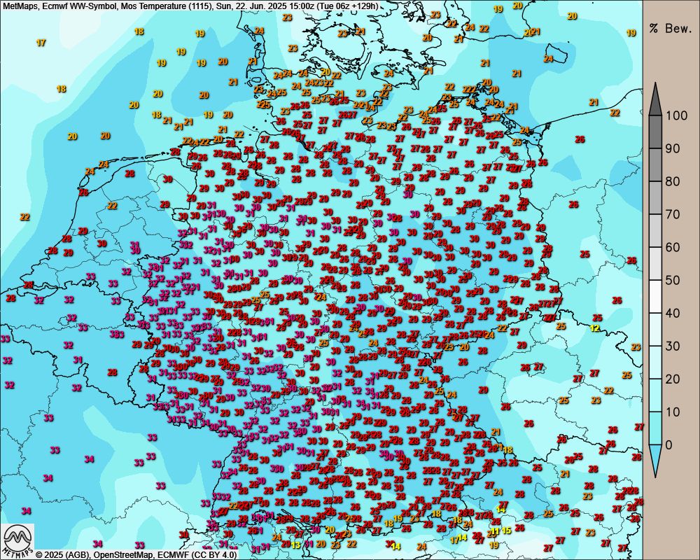 Die Karte zeigt Temperaturen und Bewölkungsgrad am Sonntag, den 22.06. (15 Uhr).