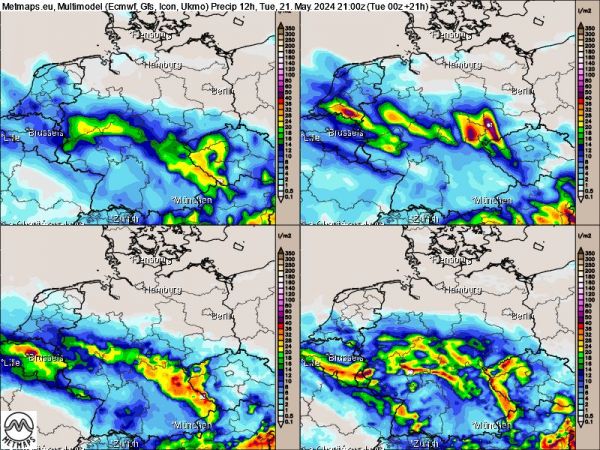 Das Starkregengebiet zieht dabei heute von Baden-Württemberg nach Norden. Auf den Multimodellkarten (s. unten) ist zu sehen, dass erneut das das Saarland, aber auch Rheinland-Pfalz von Unwettern betroffen sein wird.