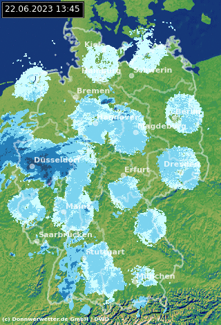 Zum Nachmittag und Abend hat uns der Gewitterklops aus Frankreich dann komplett erreicht, Dauerregen und Windböen sind dann zu erwarten. Auch die Bildung einzelner Tornados ist möglich. Am Abend und in der Nacht sind es dann Sachsen und Thüringen, die im Unwetterfokus liegen. Auch hier sind Gewitter mit Starkregen möglich, im Erzgebirge etwa können Regensummen über 50 l/m² zusammenkommen. In einzelnen Täler besteht Überflutungsgefahr.