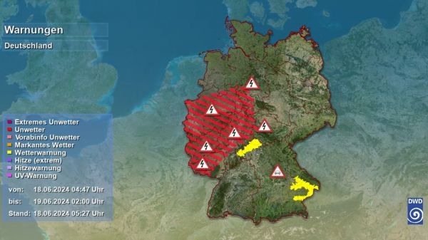Aktuelle Unwetterwarnlage, Stand 18.06.2024, 05:27 Uhr