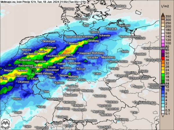 Für den heutigen Dienstag liegt eine Unwettervorwarnung des DWD für den Westen und Südwesten Deutschlands vor: Einerseits ist in den nächsten Stunden auf einem Streifen von den Niederlanden über das Münsterland, die Lüneburger Heide und nachts auch in Mecklenburg-Vorpommern mit gewittrigem Dauerregen zu rechnen.
