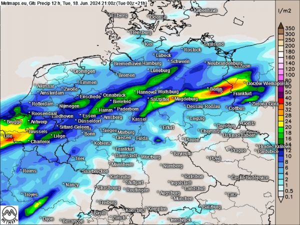 Der aktuelle GFS-Modelllauf rechnet auch Berlin/Brandenburg bis zum Abend in die Unwetterzone herein (s. Niederschlagskarte unten), verlagert das betroffene Gebiet weiter südlich und östlich.