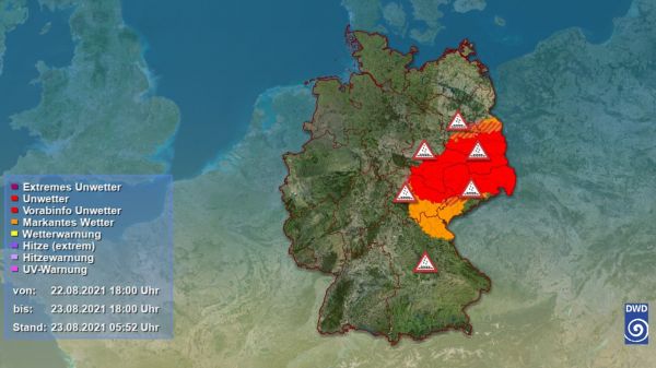 Weite Teile Ostdeutschland starten mit einer Unwetterwarnung in die neue Woche. Betroffen sind weite Teile Sachsens, der Süden Brandenburgs, Berlin, der Osten Thüringens sowie Süden und Osten Sachsen-Anhalts.