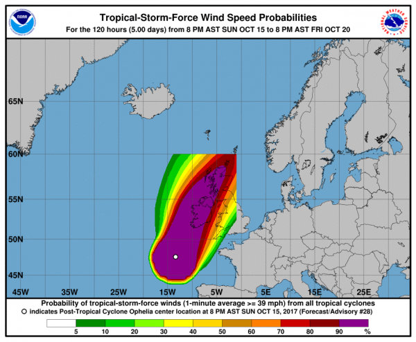 Irland bereitet sich auf einen Wirbelsturm vor. Gegen Mittag erreicht das Zentrum von Ophelia als tropischer Sturm die Südwestküste der Insel. Es wird starker Regen und Orkan erwartet. Zum Dienstag erreicht das System abgeschwächt Schottland und zieht dann als Sturm über die Nordsee in RIchtung Norwegen. In Irland ist man Sturm gewöhnt, aber einen Wirbelsturm nimmt man sehr Ernst und entsprechend fällt heute beispielsweis die Schule aus.