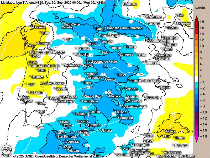 Die 24-Stunden-Regenmengen für Montag sowie die Temperaturabweichung in 1.500 m Höhe nach Icon: